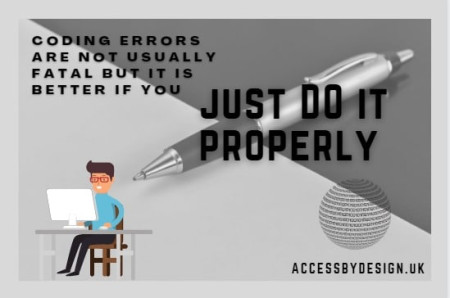 on August 27, 2020 at 11:07am |Updated on June 17, 2024 at 2:12pm A grayscale image features a pen on a two-tone surface. Text reads, Coding errors are not usually fatal but it is better if you just do it properly. A small cartoon of a person typing at a computer desk is placed on the left. ACCESSBYDESIGN.UK is at the bottom right.