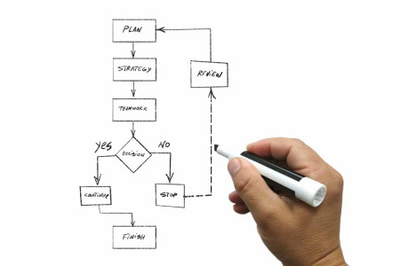 There is a flow chart, in the background that illustrates a decision making process; planning, strategizing, working as a team and making decisions.