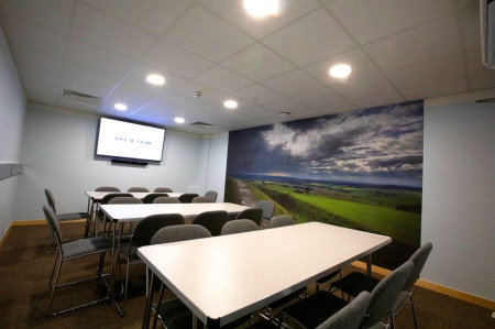 on October 25, 2022 at 10:37am |Updated on January 29, 2024 at 3:16pm A conference room with white rectangular tables and gray chairs in front of a mural depicting a landscape with green fields and a cloudy sky. There is a wall-mounted screen displaying the text ONE O FOUR. The room has a modern ceiling with recessed lighting.